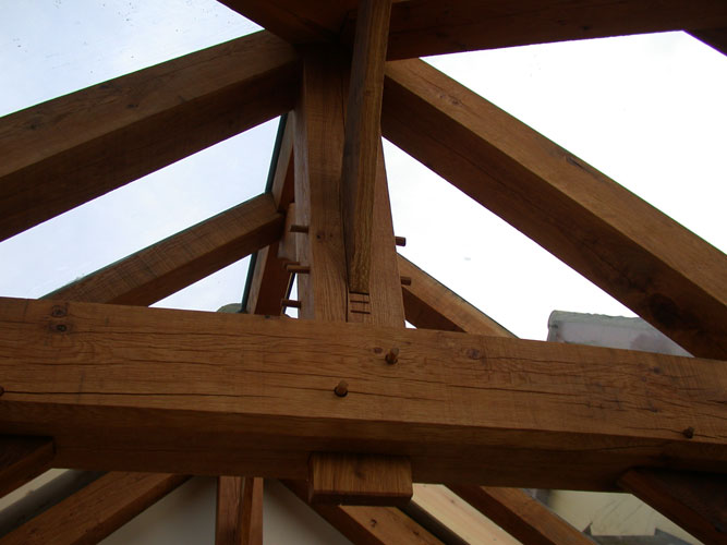 The frame incorporates a few subtle and different details that we felt would be fun to do; tapered primary rafters with backing cuts on the hips and gently curved tie beams with braced king posts above. The king post trusses allowed us to easily incorporate a ridge purlin that supports the glazing at the apex and while the walls are direct glazed on the roof we used the exitex system for simplicity. The idea was to create a frame that almost appeared to be unglazed and allow us to feel as though we were almost within the garden rather than in the house. There are of course a few things I would do differently now and it has given me lots of tips and ideas to pass on to clients but it is still a great frame and a lovely building to be in.