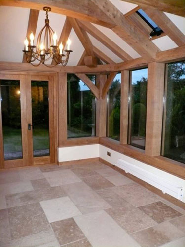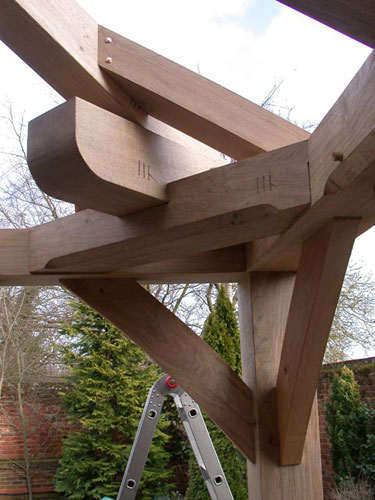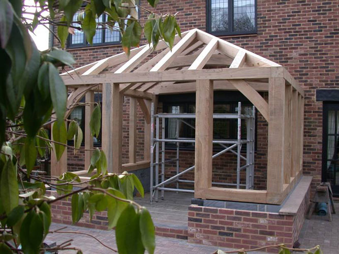 This two bay garden room is similar to the one we built in Yorkshire and was the starting point for our design after the clients identified this as one they admired. It uses the dragon braced assembly in the corners beneath the hipped roof for extra rigidity as well as providing some drama to the space. The frame was worked up in Sketchup by Sally and then revised once an architect had been appointed (Philip Conway from Essex who we have worked with several times). For the first time we not only planed the timbers but raised the frame pre-waxed so we had to keep everything clean and hope for good weather!