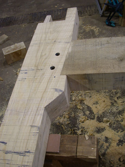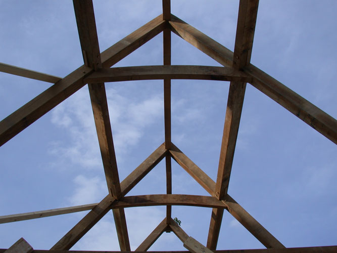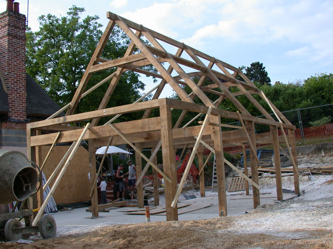 This extension is designed with some historically inspired details but is essentially a contemporary design. It will be infilled with softwood studs and plaster board exposing only the framed primary timbers. The clasped purlin roof uses Elm splines to fix each to its neighbour; this is a Japanese/Korean method of jointing small section timbers together.