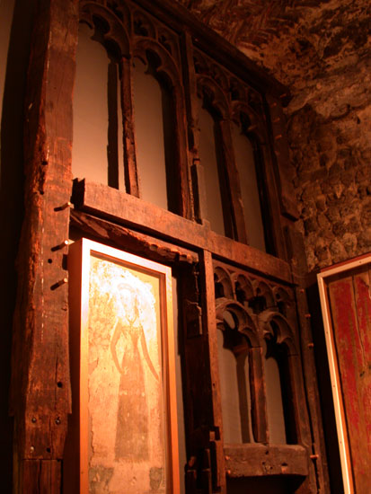The facade of the shop of a notable Colchester apothecary was recreated using a carved corner post from the collection. The framing details were taken from ancient shopfronts surveyed within the town and the exterior was painted with red ochre; the corner post had evidence of having been part of a brightly decorated building.