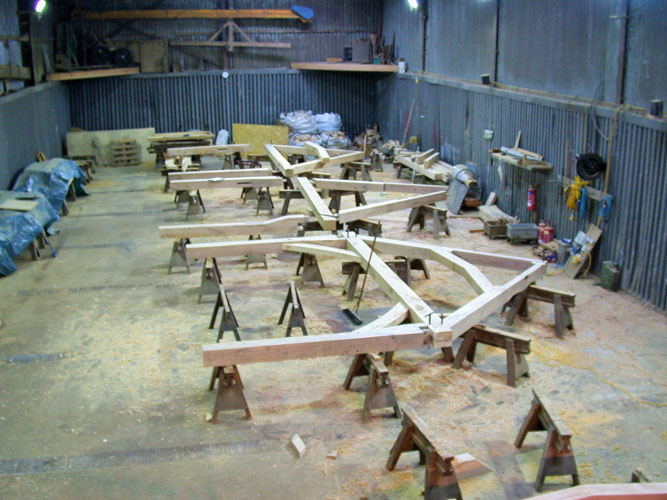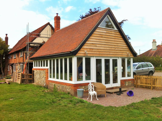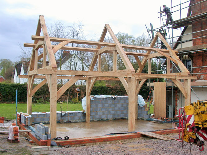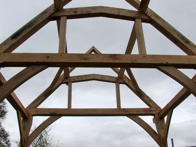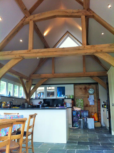 This was a joint project between us and Sadler Traditional, we were asked to produce a contemporary kitchen diner extension that felt open and airy yet was respectful to the existing 16th century house. We designed the frame with no sole plates for a more contemporary feel but used historical details such as diminished principal rafters, jowled posts and heavily cranked collars to give it a simple elegance without it being too fiddly. Cut entirely from oak felled at Ickworth Park near to Bury St. Edmunds it makes a handsome addition to the family home.
