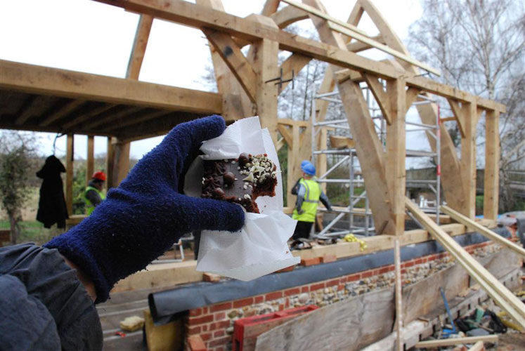 This wonderful cruck framed project was the end result of much careful design by the clients themselves. Our brief was to produce a hefty cruck frame with many natural shapes (each cruck differs from the next) and a great gallery area that overlooks the river Gipping. The sweet chestnut rafters are all natural shapes cut from woodland thinnings and were a real challenge for the sawyer to supply as we needed a flat surface in one plane and wobbly natural edges in the other! The finished frame is a team favourite!
