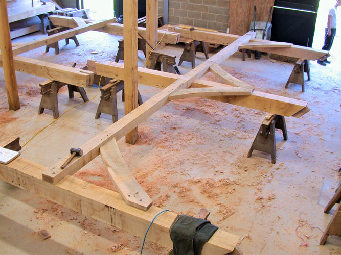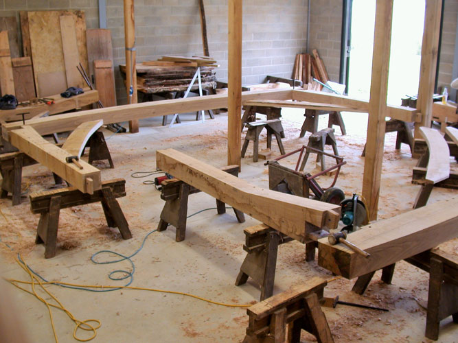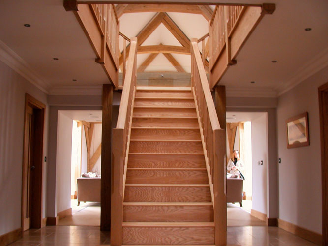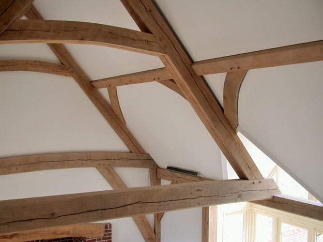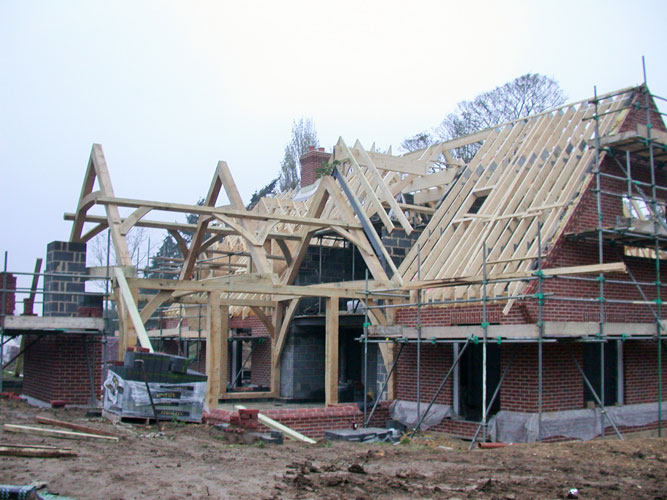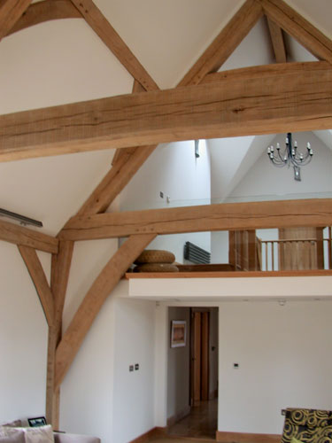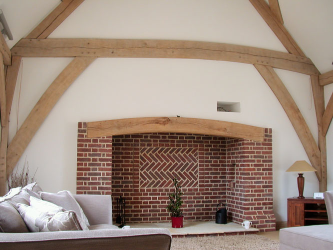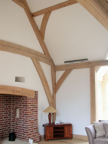 The owners of this new house run a bricklaying company so it was only natural that Neal and Amanda designed a brick-built home when they moved to Suffolk. However, the addition of a full height lounge space was made all the more elegant with the addition of one of our frames. Large jowled posts with beautiful lounge braces in the crossframes plus gently curved tie beams make for a dramatic and beautiful space without spending too much money.
