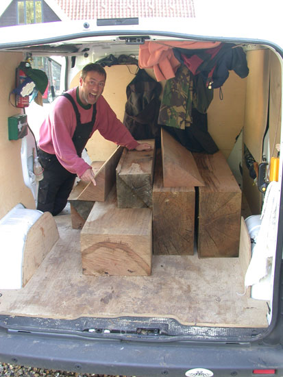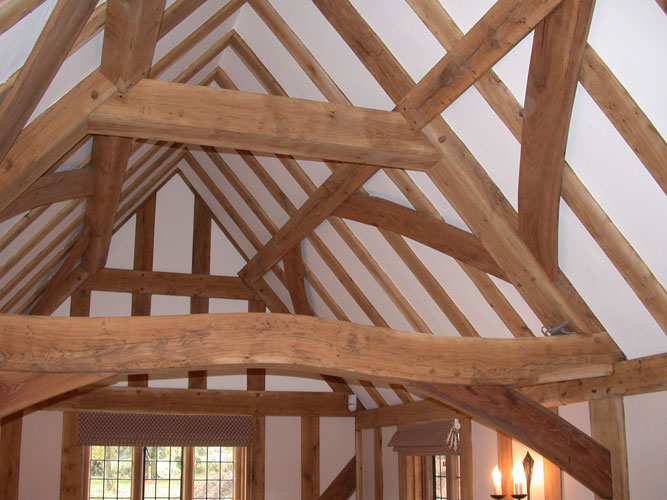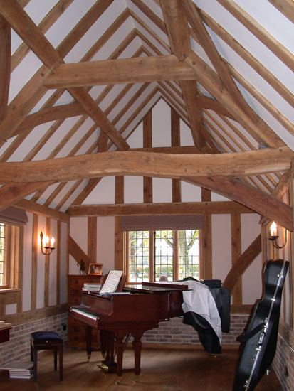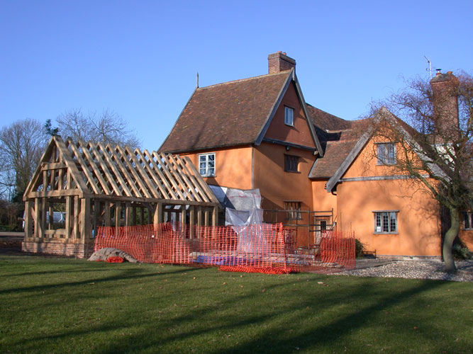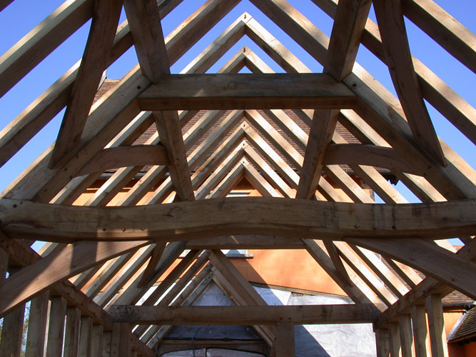 Most of the timber in this small extension is from a Woodland Trust site near Stowmarket. A clasped purlin roof was chosen to allow the frame to be assembled mostly by hand, it is also much the same as in the existing house frame. The wobbly tie beam is cut from a naturally shaped timber and was real fun to do!