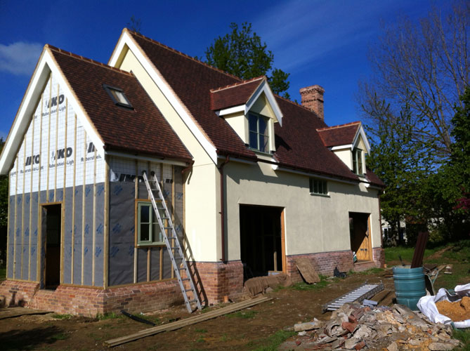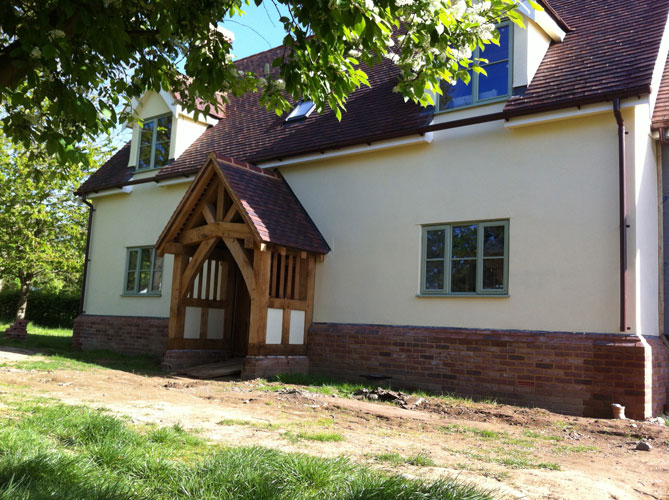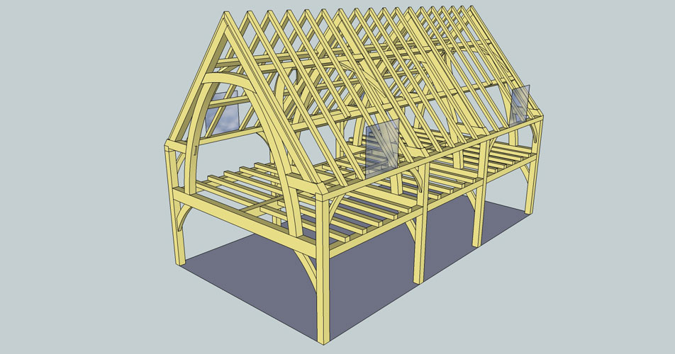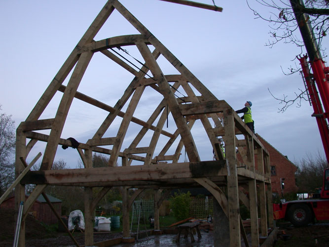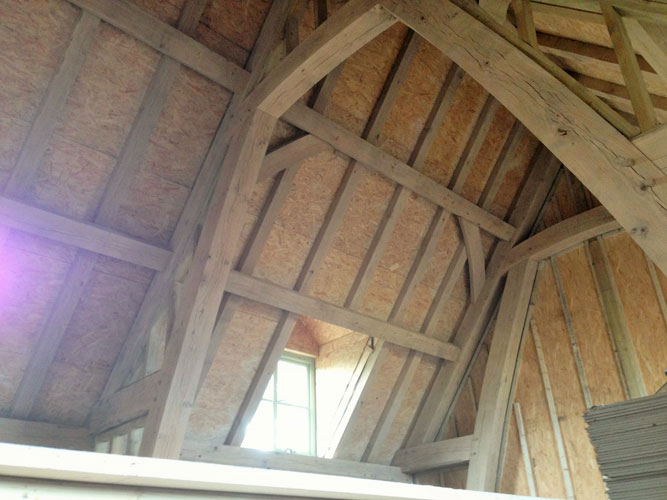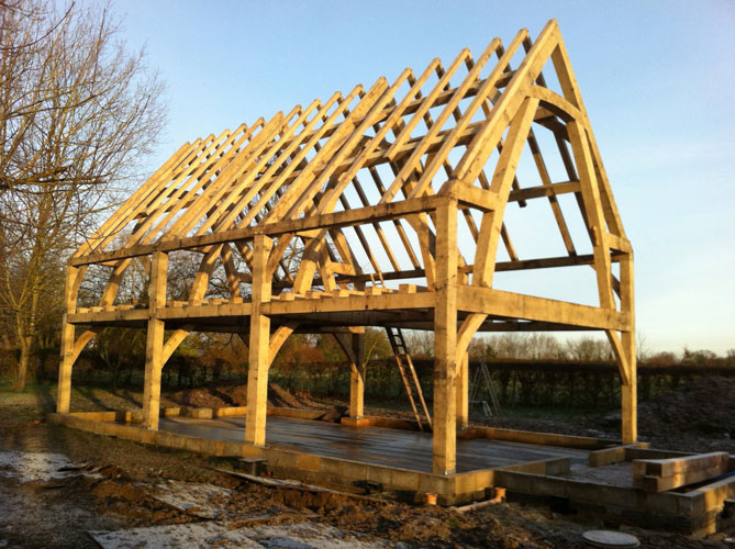 Rick first met Joel at Orchard Barn where he was an intern/volunteer for a few months. His athletic energy made short work of much of the hewing and trestle sawing so once his stint was completed at the barn we gave him some temp. work with us during a busy summer. Joel has made regular return visits to the team when we have need of extra hands so it was probably only natural that when we decided to build his own house that we would help him for once! Sally designed a simple open frame that used large “jamb de force” struts that rise from the first floor rail to the collars in the roof. This gives a soaring open space that permits easy access through the first floor levels and lends itself well to a dramatic aesthetics at a sensible cost due to the low number of joints needed in such a design. The whole frame is then clad with structural insulated panels (SIP’s) and rendered to create a very well insulated new home. Well done Joel!
