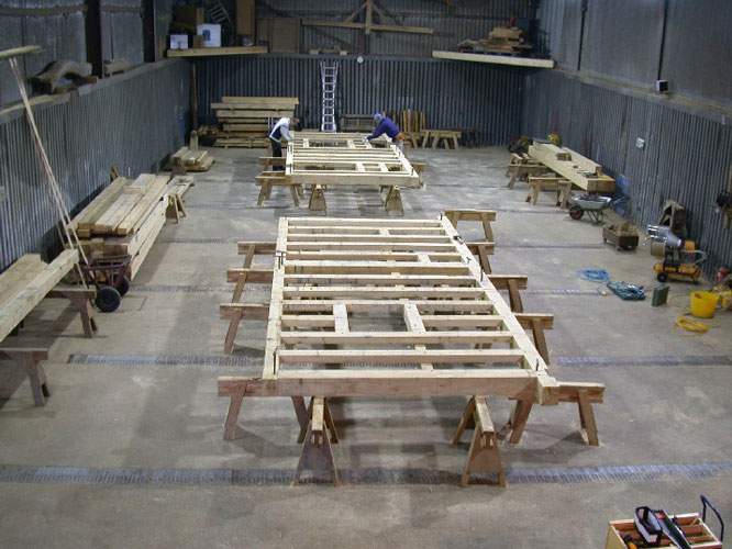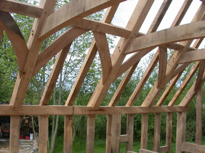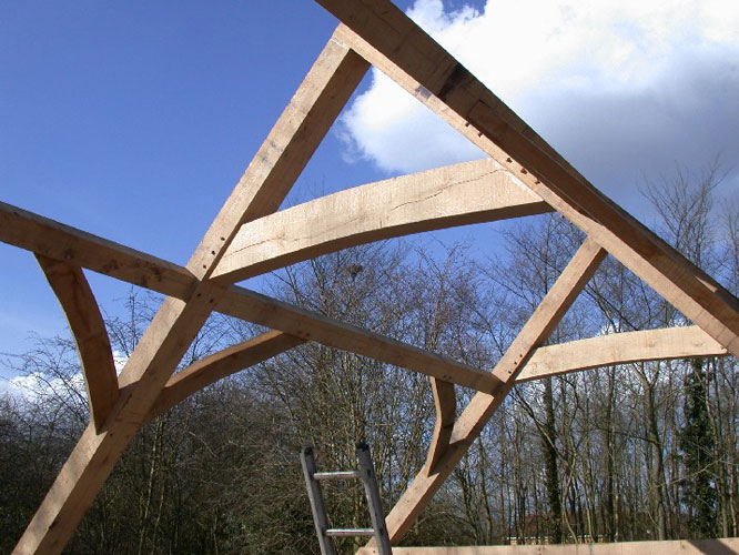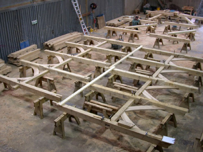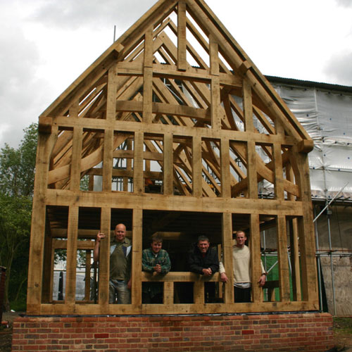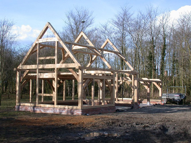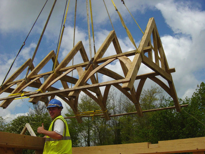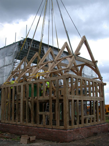 This badly damaged building (see repairs section) had a close-studded extension added as well as a small barn workshop and two bay cartlodge garage. The extension roof was assembled on the ground and carefully lifted into place with a crane. With the existing house covered with scaffolding this wasn't entirely straightforward but within half an hour it was safely in place; great fun!