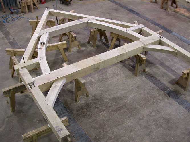 It uses Jambs-de Force (legs of strength) in the first floor trusses, more commonly seen in France and the Low Countries these large curved timbers resist the thrust of the rafters and allow use of the roof space. Simple but elegant.