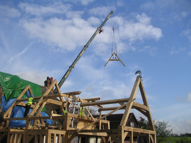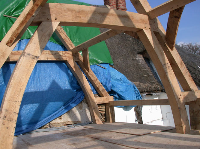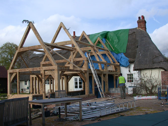 This three bay extension has a first floor bedroom and bathroom with the end bay being open right up into the roof space. It will be infilled with softwood and plasterboard and the framed primary timbers exposed internally.