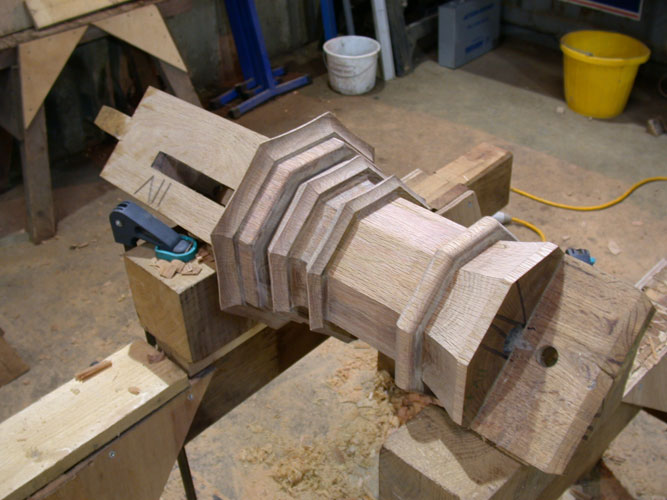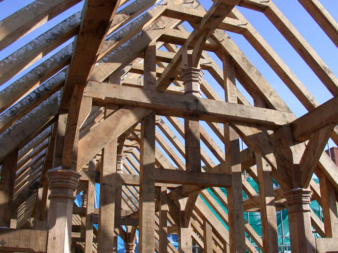 Not only does it have moulded crown posts in the roof, but is loosely based on the Suffolk raised aisle tradition, incorporating large moulded capitals to the arcade posts. Although covering a relatively small area, it has much detail and many timbers; probably the most complicated frame we have yet built.