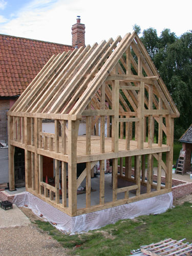 This traditionally inspired extension frame was added to a 16th century frame in the fantastically named hamlet of Pixey Green, Suffolk. It has trenched wall bracing and a clasped-purlin roof frame typical of the Elizabethan period in this area. A heavy floor frame sits on posts that have jowls at both first floor and tie beam level.
