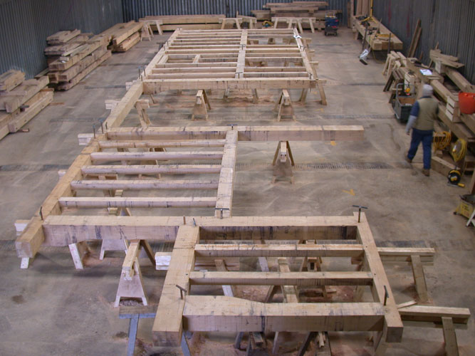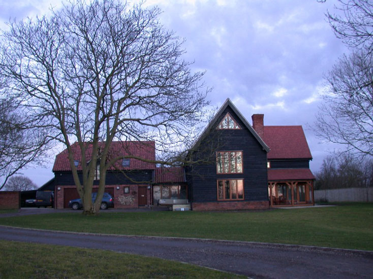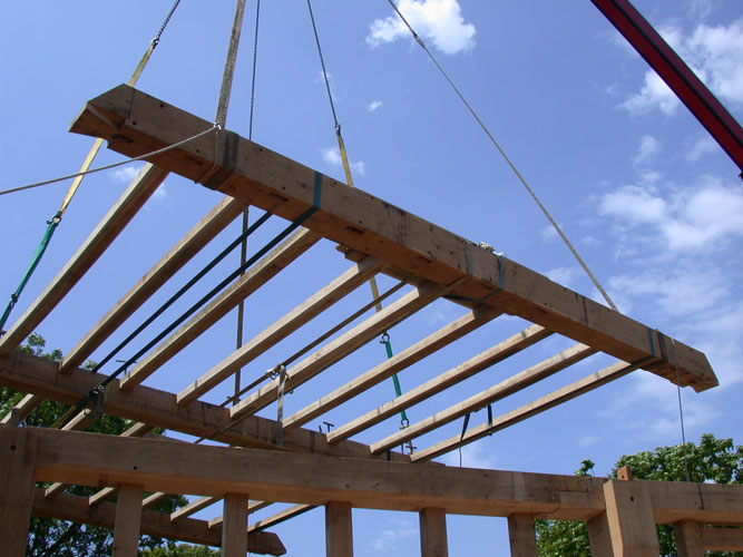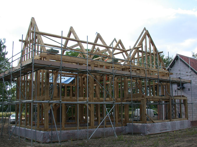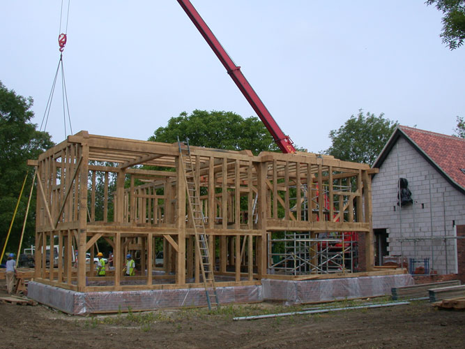 Framed over four months it was raised in July 2003. Of note are the ceiling joist frames above the first floor; these were assembled in two bay units on the ground and lifted into position with a crane. In all it took about a week and a half to raise with the aid of a crane.