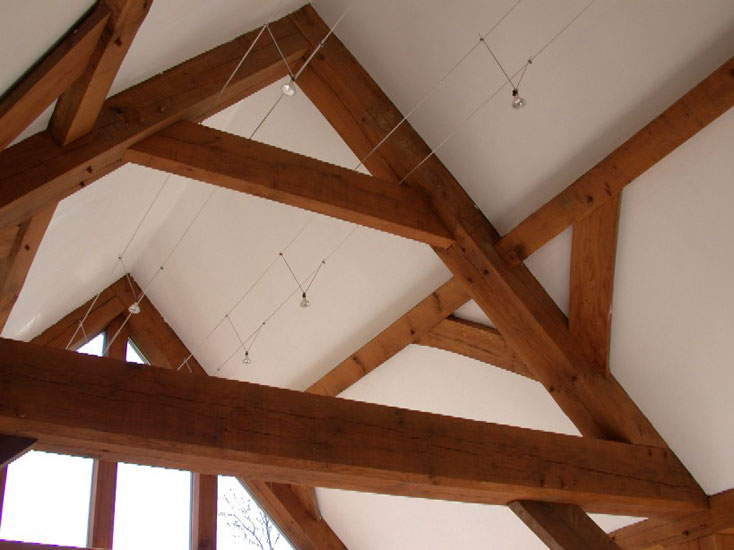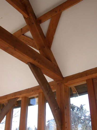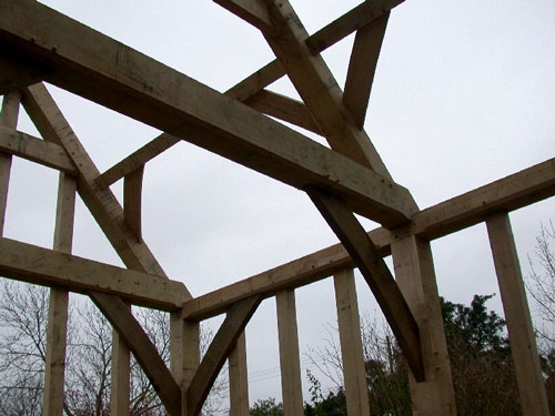 A very simple yet elegant frame that uses the main house as its inspiration (without being a slavish copy) which we all enjoyed making. The frame was cut and raised in three weeks and will have (hidden) softwood rafters with shaped oak sprockets at the eaves.