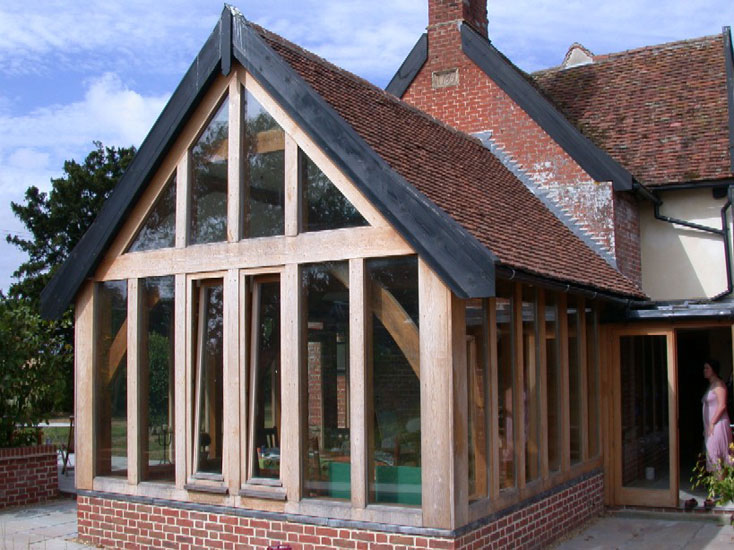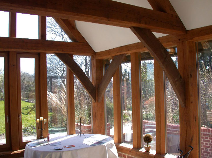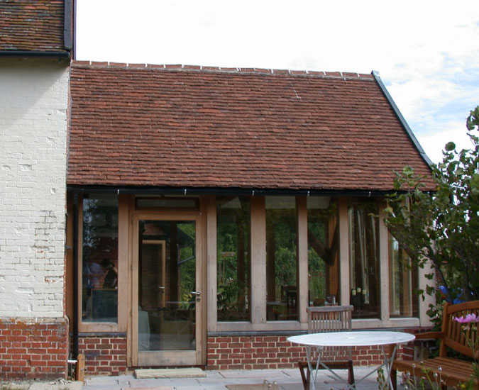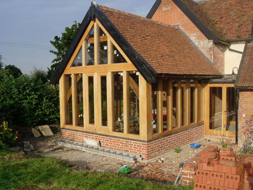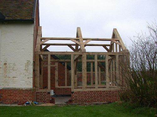 We have worked on Rob and Anne-Laure's 16th century house over many years, gradually working our way round repairing plates as required. Now that the repair work is complete we were asked to frame a new garden room extension for them which once finished will have double glazed side walls.