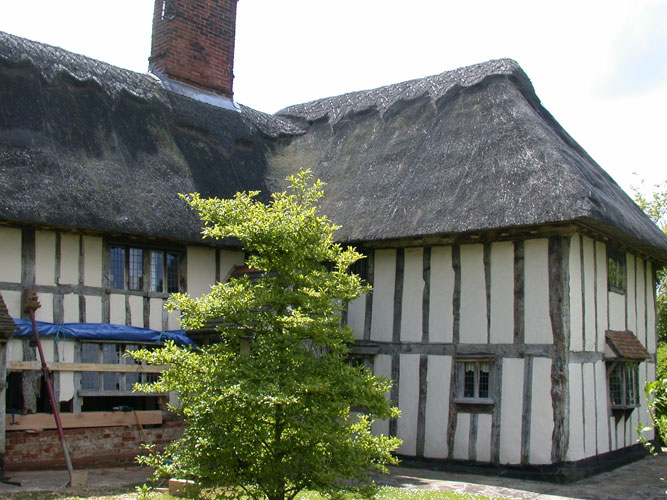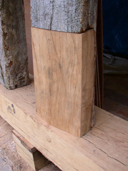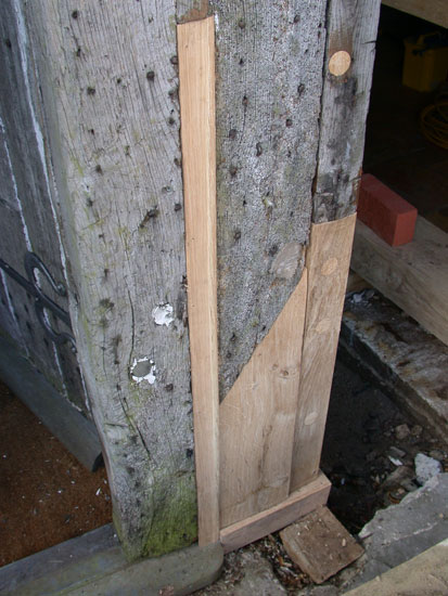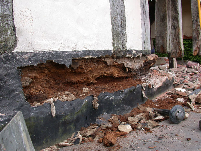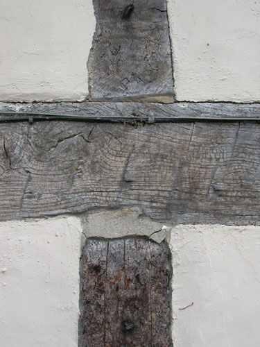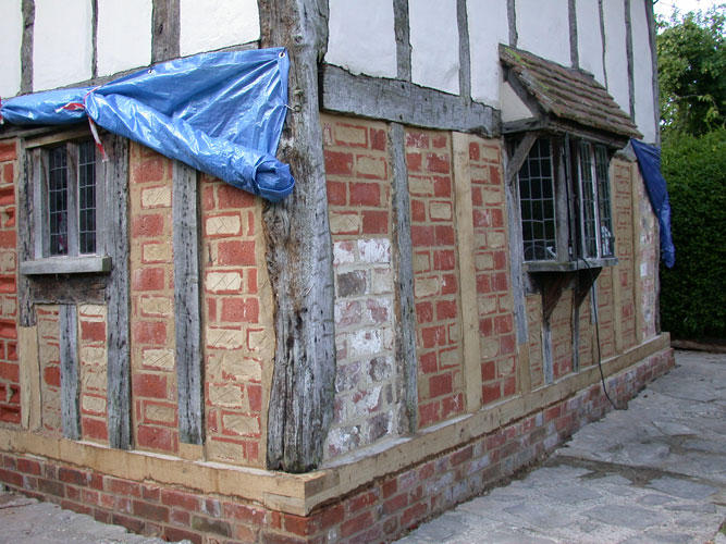 We replaced most of the sole plates to this 16th century frame as well as many repairs to the studs. Cement rendered brick infill had been put in the frame sometime during the 20th century and the surrounding timbers were beginning to show problems. Also I don't think we've ever seen quite as much silicone sealant used to patch up a building! This too was helping to trap in moisture and hasten decay. New infill panels still used soft red brick but laid in lime with a lime render over the top. Then a coat of limewash to help fill the many fissures in the timbers and shed water more efficiently.