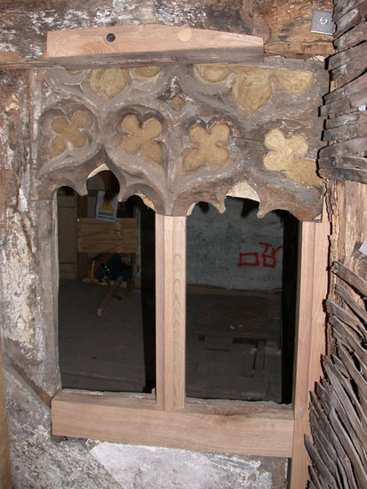 Further along the range of buildings was a 14th century moulded window; this had fell out during the refurbishment work and needed re fixing along with a new mullion, post and a patch repair to the sill. To complicate matters, the rear of the window head had been blocked at a later date with a plaster panel that had the remnants of a 17th century paint scheme attached. The whole assembly was conserved (by Andrea Kirkham) and then carefully reinstated to its former position.