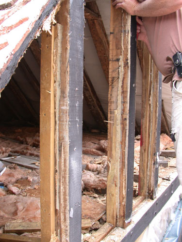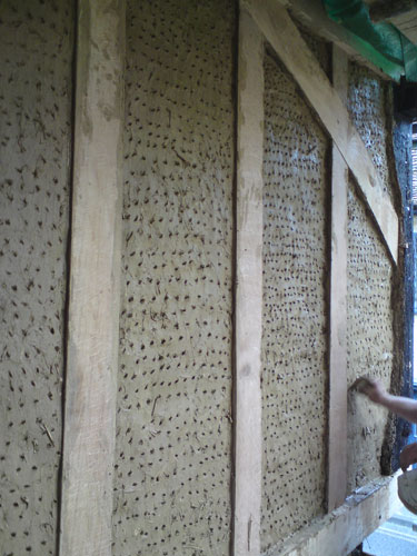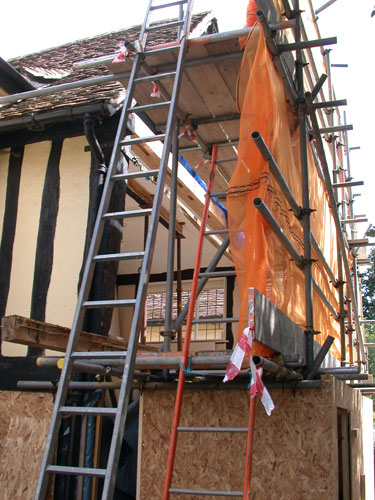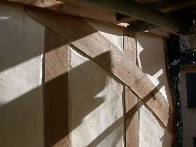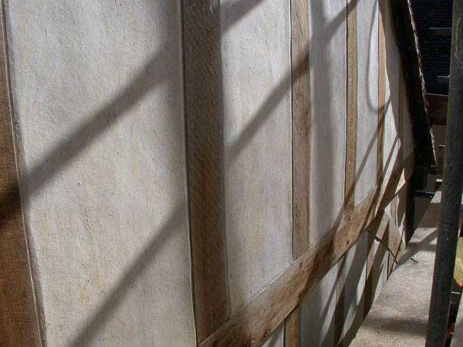 This gable had been very poorly rebuilt by a local contractor and contravened the listed building consent that had been issued by the local authority. We were asked to rebuild the gable based on photographic and survey evidence so that the enforcement notice could be lifted. Only the two corner posts and a pair of rafters survived, the previous builders illegally skipped everything else so we had to pretty much start from scratch. Rebuilding whole sections is something we have become known for but not only is it extreme carpentry but it is also a difficult proposition in terms of logistics as there are the existing (distorted) building lines to follow and of course fully understanding the assembly sequence is crucial to its success. On top of that we had the delicate issue of enforcement action to work within dealing with both the owner and the local authority.