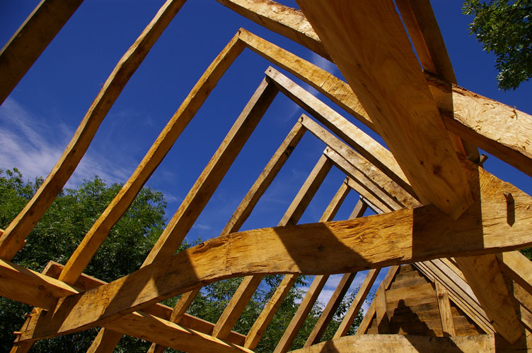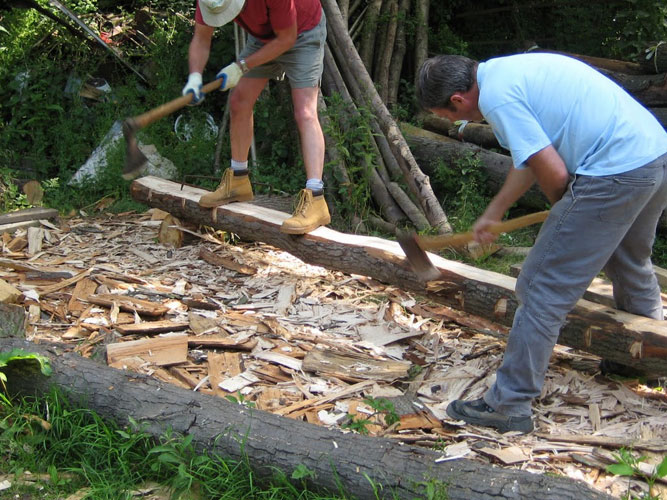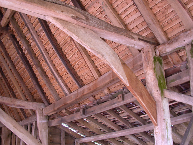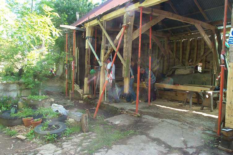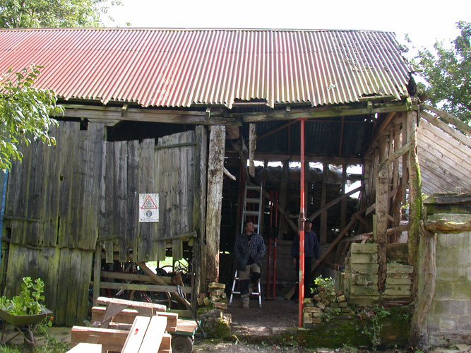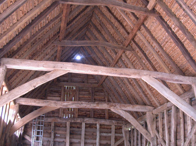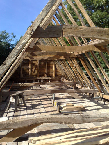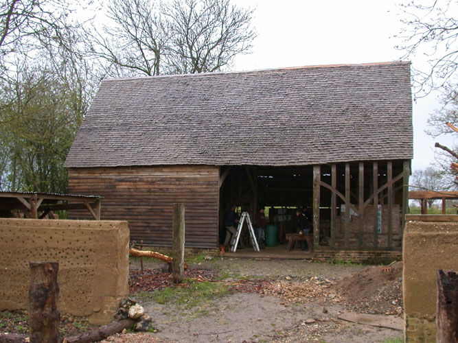 The site is very much “off-grid” so each course has been designed to use ancient techniques as well as many ancient tools in the hope that it stimulates a further understanding of the skills of our forebears and that simple vernacular carpentry is rightly valued as much as the higher status work of the past. In 2010 Orchard Barn Environmental Education and Rick organised four week-long practical courses in ancient roof-framing techniques and the various students hand-converted timbers from a nearby ancient woodland to make a simple clasped purlin roof. The roof frame was researched and designed to complement the existing wall frames and once raised it was clad with 20,000 hand-cleft oak shingles also cut by students and volunteers.
